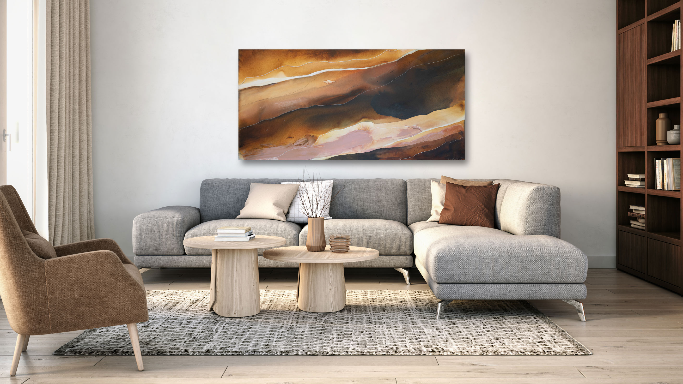 Agadir is part of my Marrakesh series focusing on the iconic colours and patterns of this ancient city in Morocco. The historical quarters of these African desert towns are a sensual experience of colour, energy and movement, with maze-like alleys winding through the marketplaces, where vendors sell traditional textiles, pottery, spices and jewellery. I have mixed a variety of desert colours for use in these paintings: ochres, terracotta’s, pinks, and browns, plus a selection of oxide, to create the effect of moving through this unique landscape.